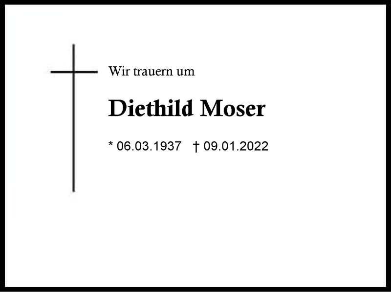 Hier finden Sie alle Traueranzeigen aus der Zeitung, die bisher für Diethild Moser erschienen sind. Weitere Traueranzeigen, die in der Zeitung erscheinen, werden hier ebenfalls aufgelistet