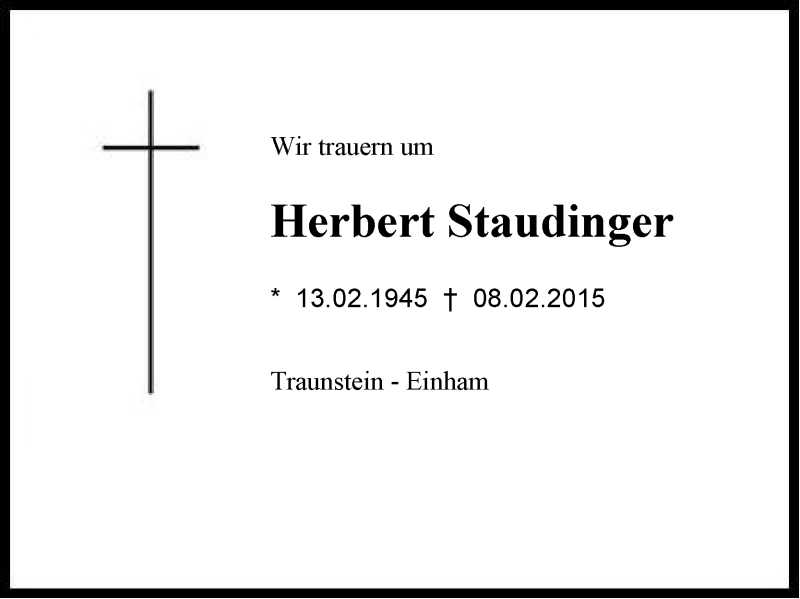 Hier finden Sie alle Traueranzeigen aus der Zeitung, die bisher für Herbert Staudinger erschienen sind. Weitere Traueranzeigen, die in der Zeitung erscheinen, werden hier ebenfalls aufgelistet