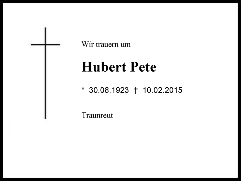Hier finden Sie alle Traueranzeigen aus der Zeitung, die bisher für Hubert Pete erschienen sind. Weitere Traueranzeigen, die in der Zeitung erscheinen, werden hier ebenfalls aufgelistet