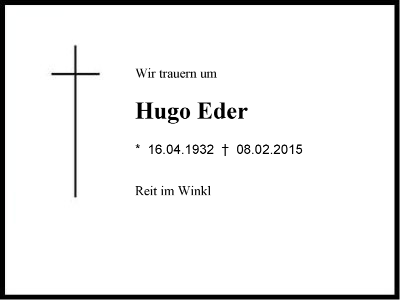 Hier finden Sie alle Traueranzeigen aus der Zeitung, die bisher für Hugo Eder erschienen sind. Weitere Traueranzeigen, die in der Zeitung erscheinen, werden hier ebenfalls aufgelistet