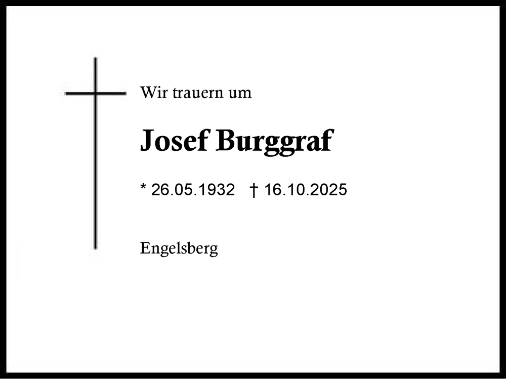 Hier finden Sie alle Traueranzeigen aus der Zeitung, die bisher für Josef Burggraf erschienen sind. Weitere Traueranzeigen, die in der Zeitung erscheinen, werden hier ebenfalls aufgelistet