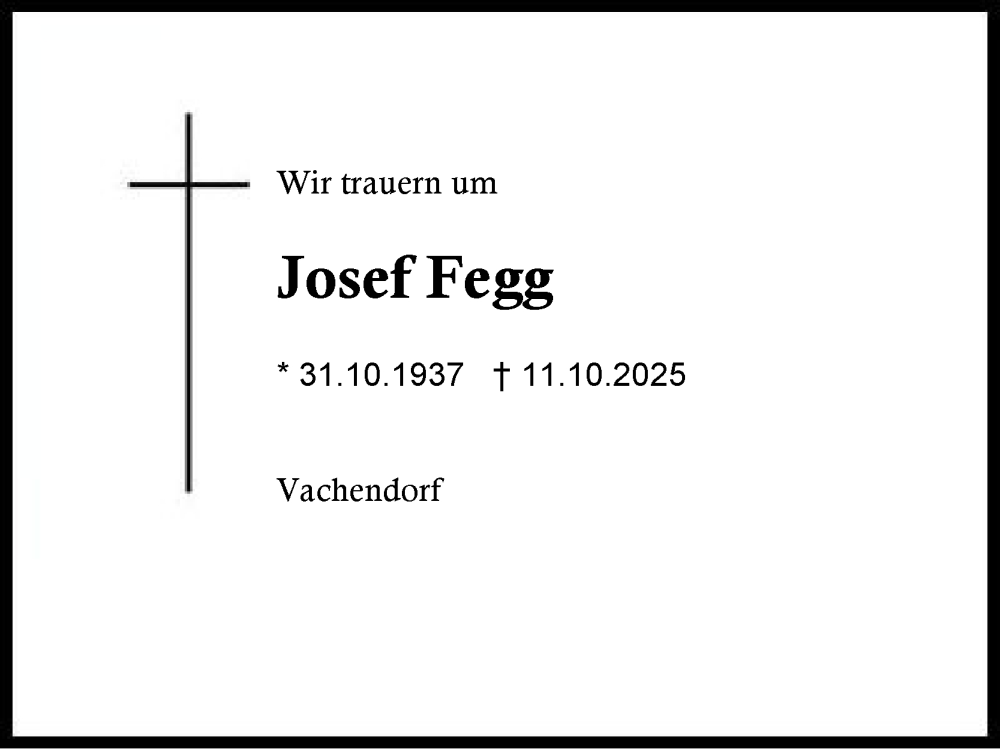 Hier finden Sie alle Traueranzeigen aus der Zeitung, die bisher für Josef Fegg erschienen sind. Weitere Traueranzeigen, die in der Zeitung erscheinen, werden hier ebenfalls aufgelistet