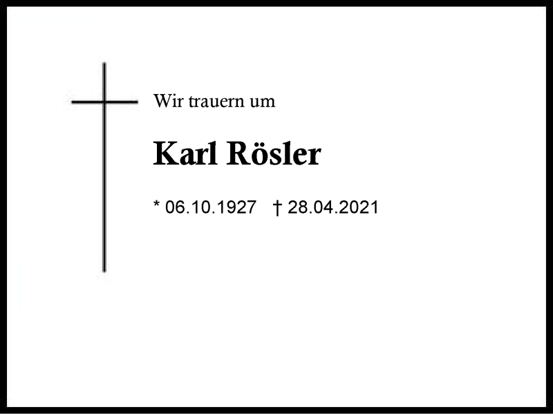 Hier finden Sie alle Traueranzeigen aus der Zeitung, die bisher für Karl Rösler erschienen sind. Weitere Traueranzeigen, die in der Zeitung erscheinen, werden hier ebenfalls aufgelistet