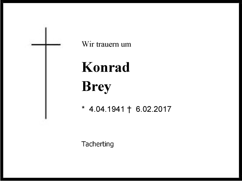 Hier finden Sie alle Traueranzeigen aus der Zeitung, die bisher für Konrad Brey erschienen sind. Weitere Traueranzeigen, die in der Zeitung erscheinen, werden hier ebenfalls aufgelistet