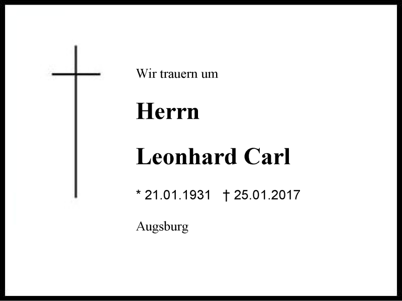 Hier finden Sie alle Traueranzeigen aus der Zeitung, die bisher für Leonhard Carl erschienen sind. Weitere Traueranzeigen, die in der Zeitung erscheinen, werden hier ebenfalls aufgelistet