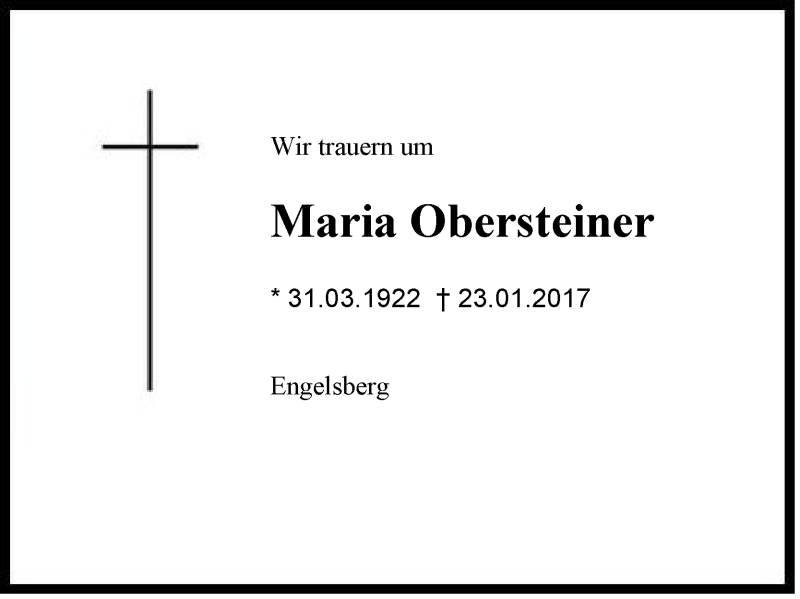 Hier finden Sie alle Traueranzeigen aus der Zeitung, die bisher für Maria Obersteiner erschienen sind. Weitere Traueranzeigen, die in der Zeitung erscheinen, werden hier ebenfalls aufgelistet