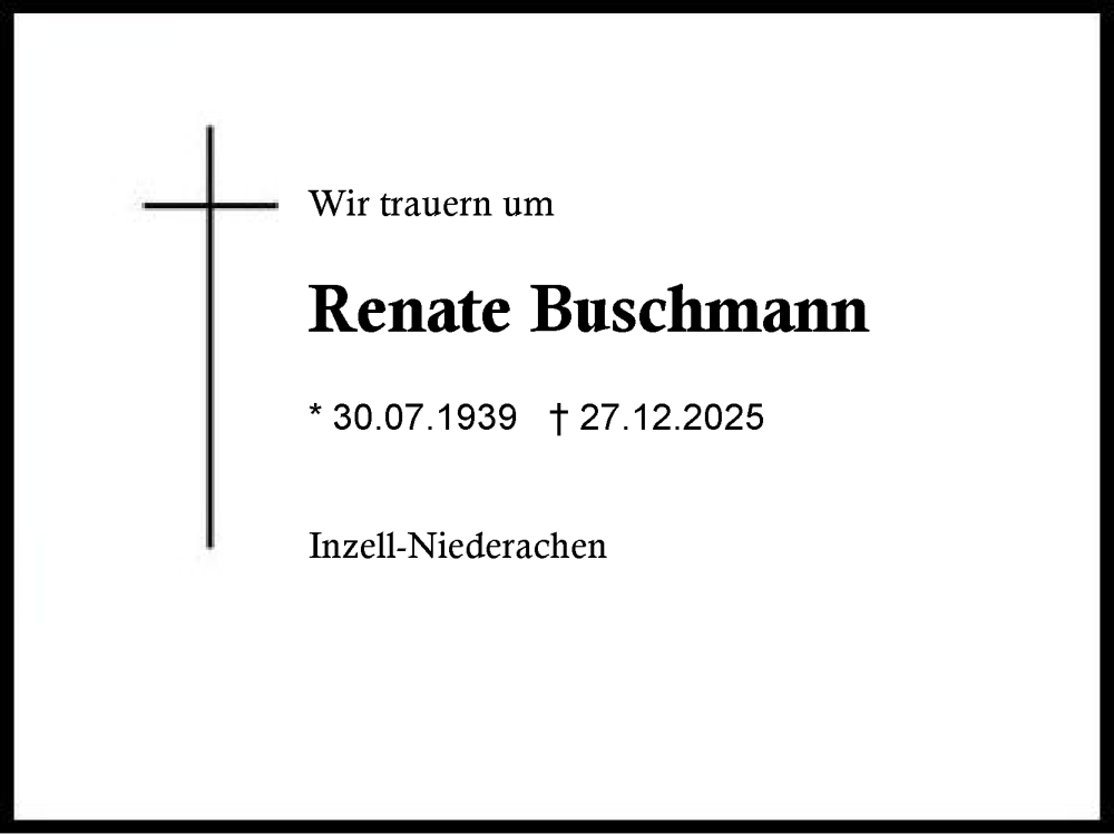 Hier finden Sie alle Traueranzeigen aus der Zeitung, die bisher für Renate Buschmann erschienen sind. Weitere Traueranzeigen, die in der Zeitung erscheinen, werden hier ebenfalls aufgelistet