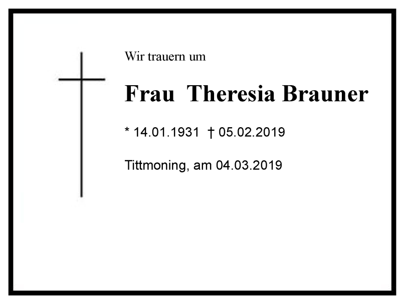 Hier finden Sie alle Traueranzeigen aus der Zeitung, die bisher für Theresia Brauner erschienen sind. Weitere Traueranzeigen, die in der Zeitung erscheinen, werden hier ebenfalls aufgelistet